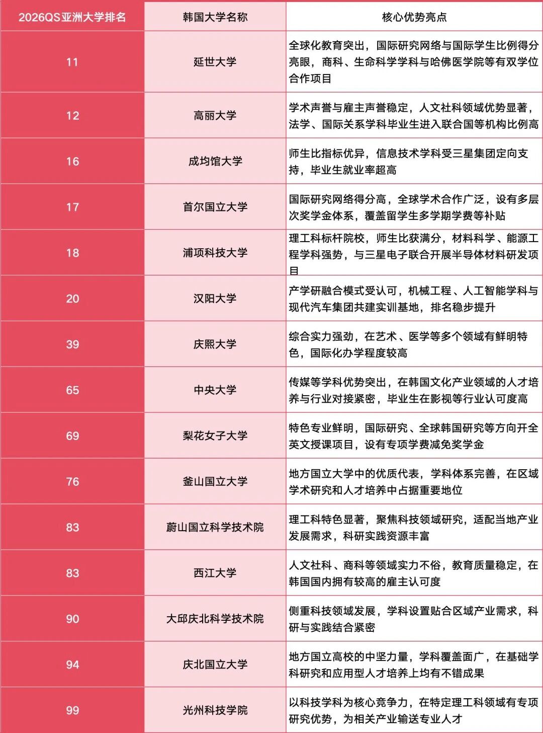 在最新的2026QS亚洲高校排名中,韩国高校表现亮眼,延世大学、高丽大学、成均馆大学、首尔国立大学、浦项科技大学、汉阳大学均跻身亚洲前二十,展现了韩国高等教育的强大实力。