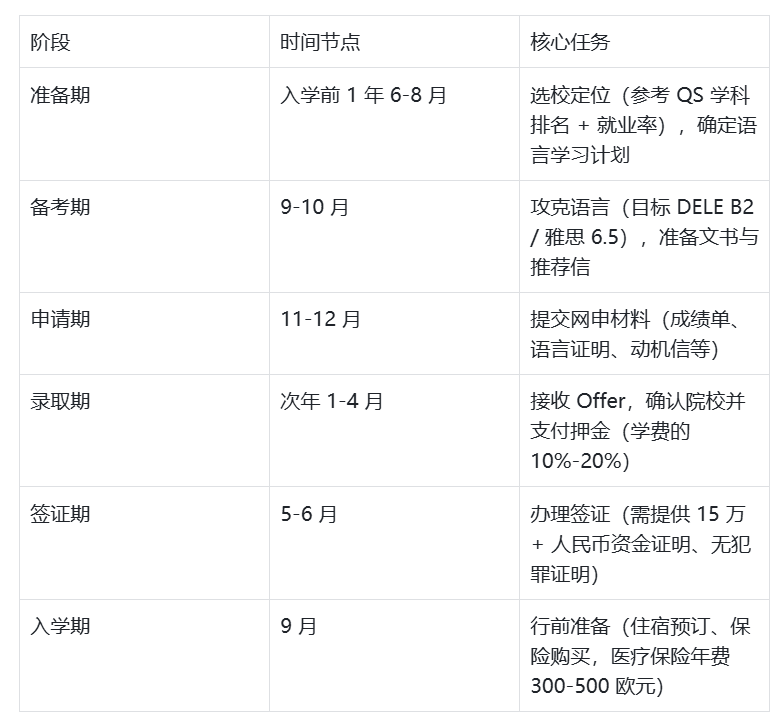 - 重点院校推荐:巴塞罗那大学(QS 前 200)、马德里自治大学、瓦伦西亚大学(留学成本较低,适合预算有限的学生)。