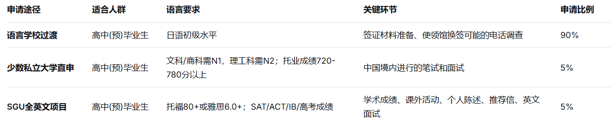中国学生申请日本本科主要有三种途径,适合不同背景和需求的学生,各类申请方式的整体比例分布为:90%的学生选择通过语言学校过渡后进入大学,5%选择申请无需考试的私立大学,另有5%申请SGU全英文授课项目。