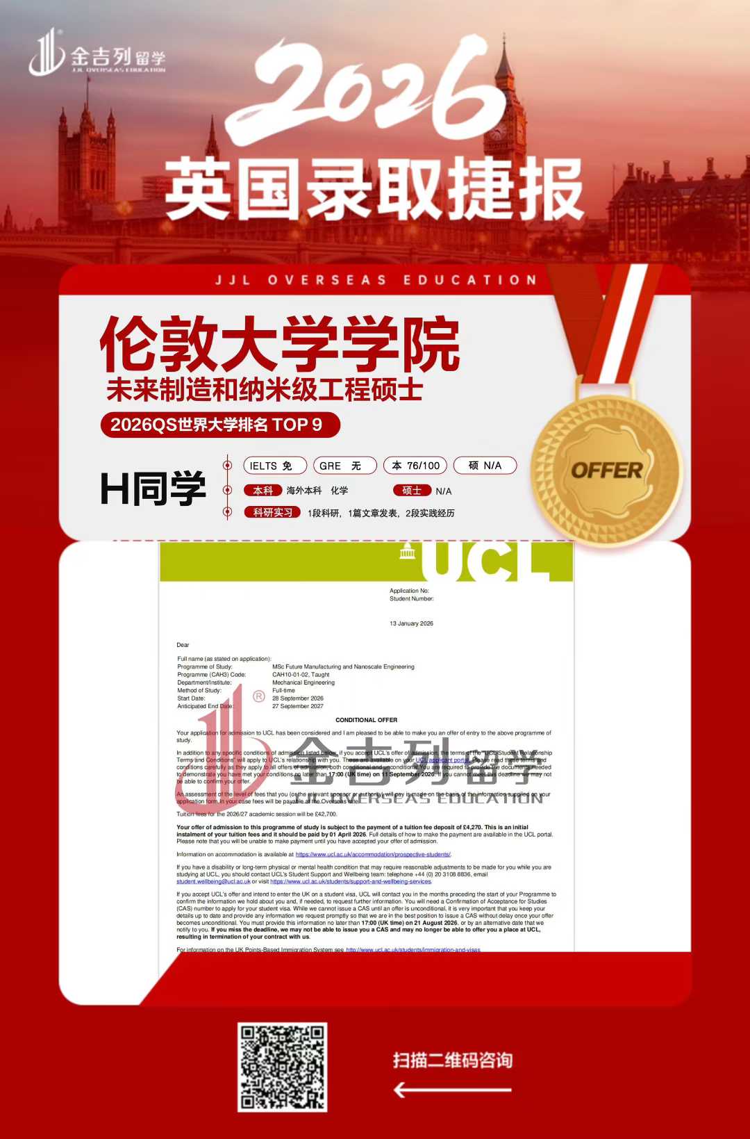 伦敦大学学院 2026QS TOP19 未来制造和纳米级工程硕士+1