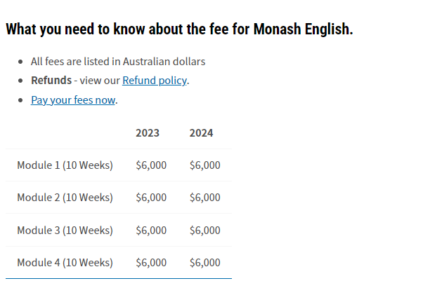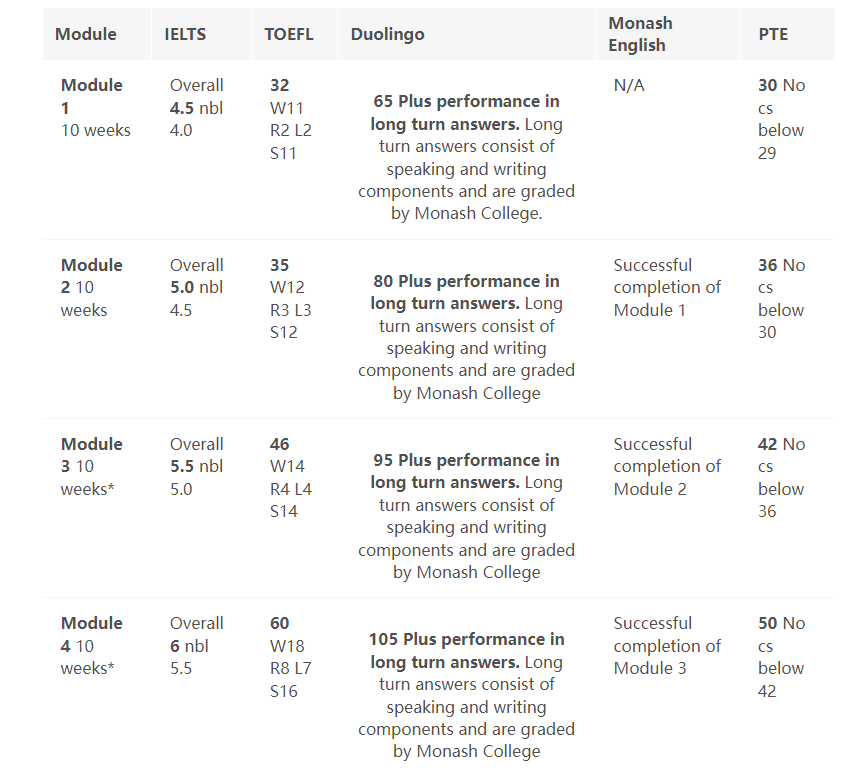 莫纳什大学的语言课分成10周、15周、20周,根据每个人的英语水平不同,上的语言班也不同。如果衔接的是莫纳什的普通课程,则要求如下: