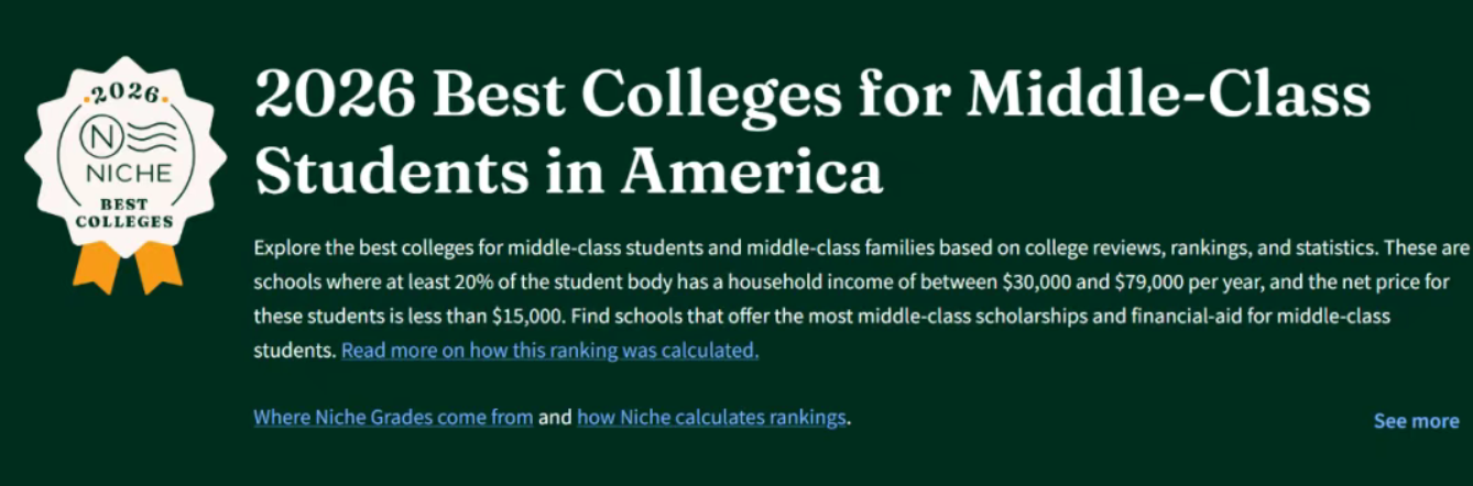 近期,美国高校版“大众点评”Niche网站发布了《2026适合中产家庭的美国大学排行榜》,盘点了美国高校中一些实力强且学费相对较为划算的院校,下面我们就一起来看下吧!