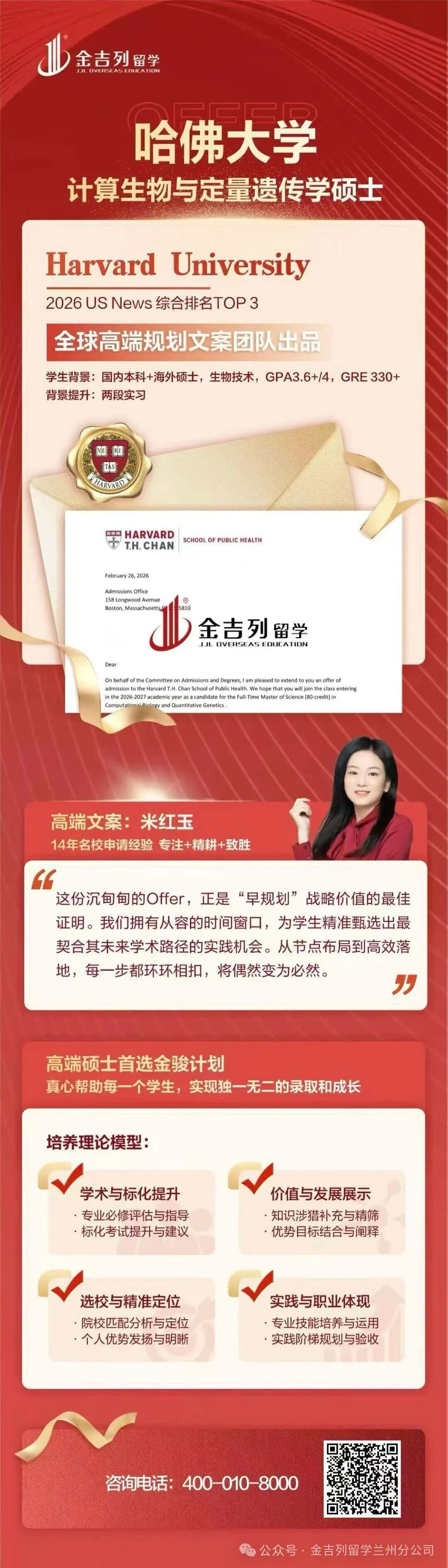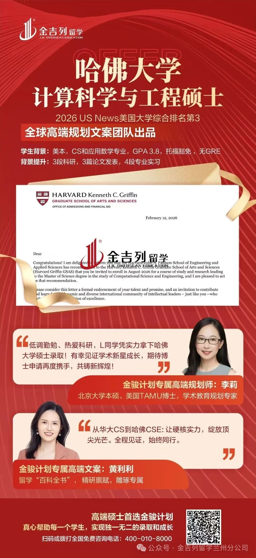 近日,金吉列留学再传捷报:两位学子凭借硬核实力,分别斩获哈佛大学计算生物与定量遗传学硕士与计算科学与工程硕士录取通知书。这不仅是个人学术生涯的高光时刻,更是金吉列“金骏计划”高端申请战略的又一有力印证。