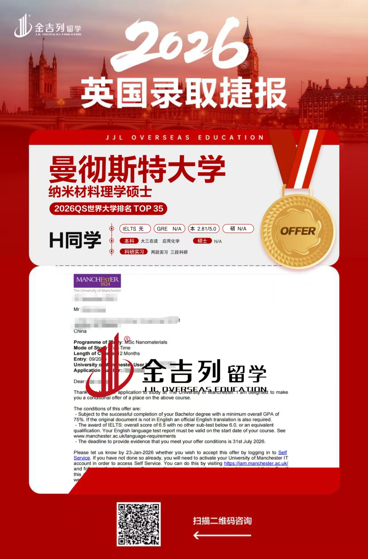 > 曼彻斯特大学纳米材料理学硕士录取案例