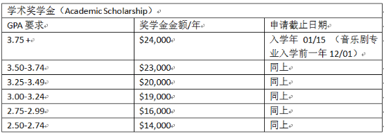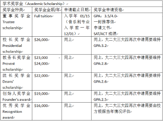 莱德大学本科转学奖学金同样可分为学术奖学金( Acaemic Scholarship)和非学术奖学金(Non-nee Opportunities)两种,其中学术奖学金免除了SAT要求,并且主要参考申请者综合GPA进行发放。而非学术奖学金种类则相对减少。具体参考如下: