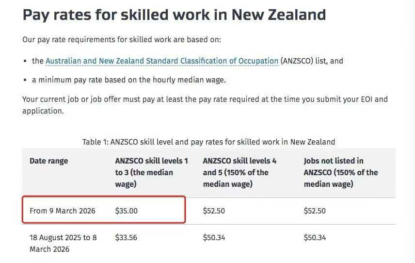 新西兰:自2026年3月9日起,工资中位数从时薪33.56纽币上调至时薪35.00纽币。