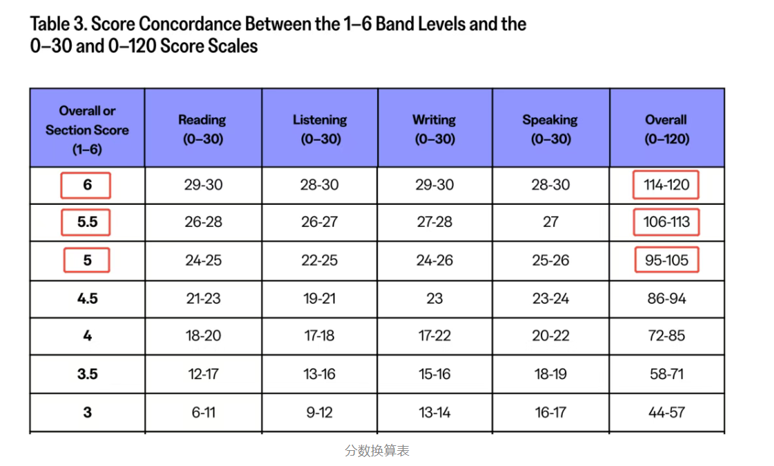 以2026年1月21日为节点,新版托福总分及听说读写单项成绩均达到5分及以上,旧版托福总分100+。根据ETS官方的换算标准,新版的5分对应旧版95-105分区间。