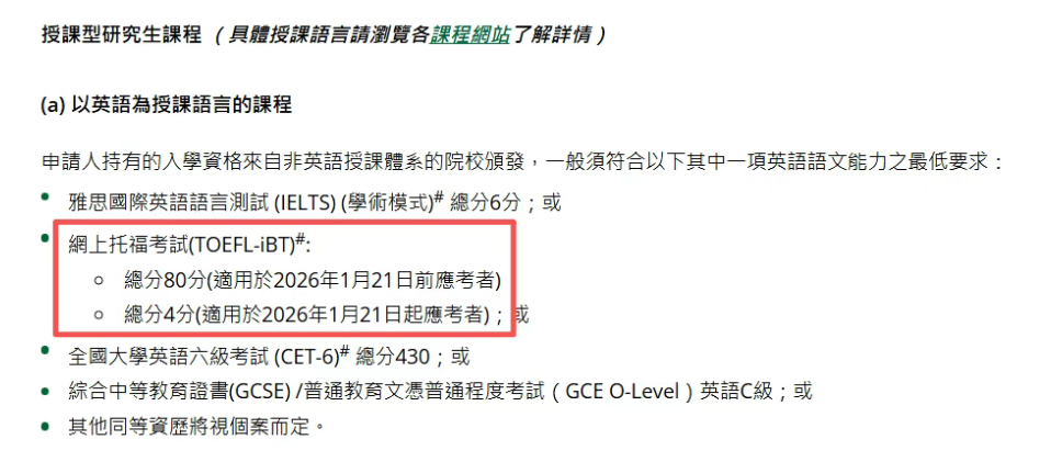 港教大研究生课程的录取要求页面已经更新新托福分数,以2026年1月21日为分水岭,实行了两套分数标准: