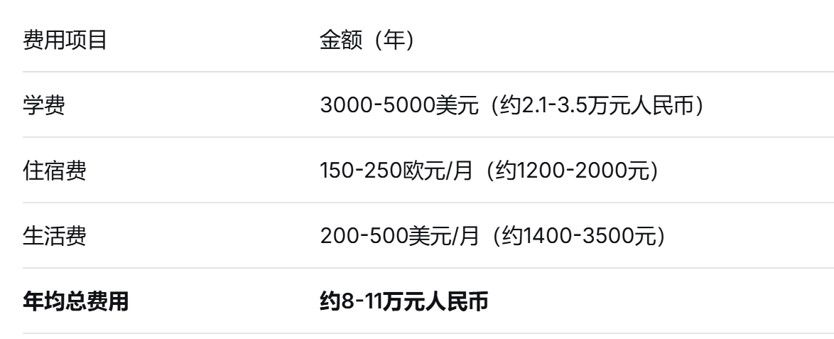 一年制硕士项目整体预算远低于英美澳等传统留学国家,甚至比国内一些中外合作办学项目更具性价比。