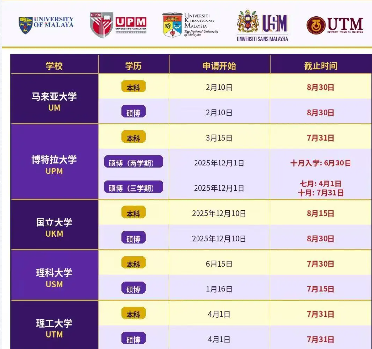 以下为马来西亚前五公立大学 2026 秋季入学申请时间节点(截止时间请以各校官方网站公告为准):