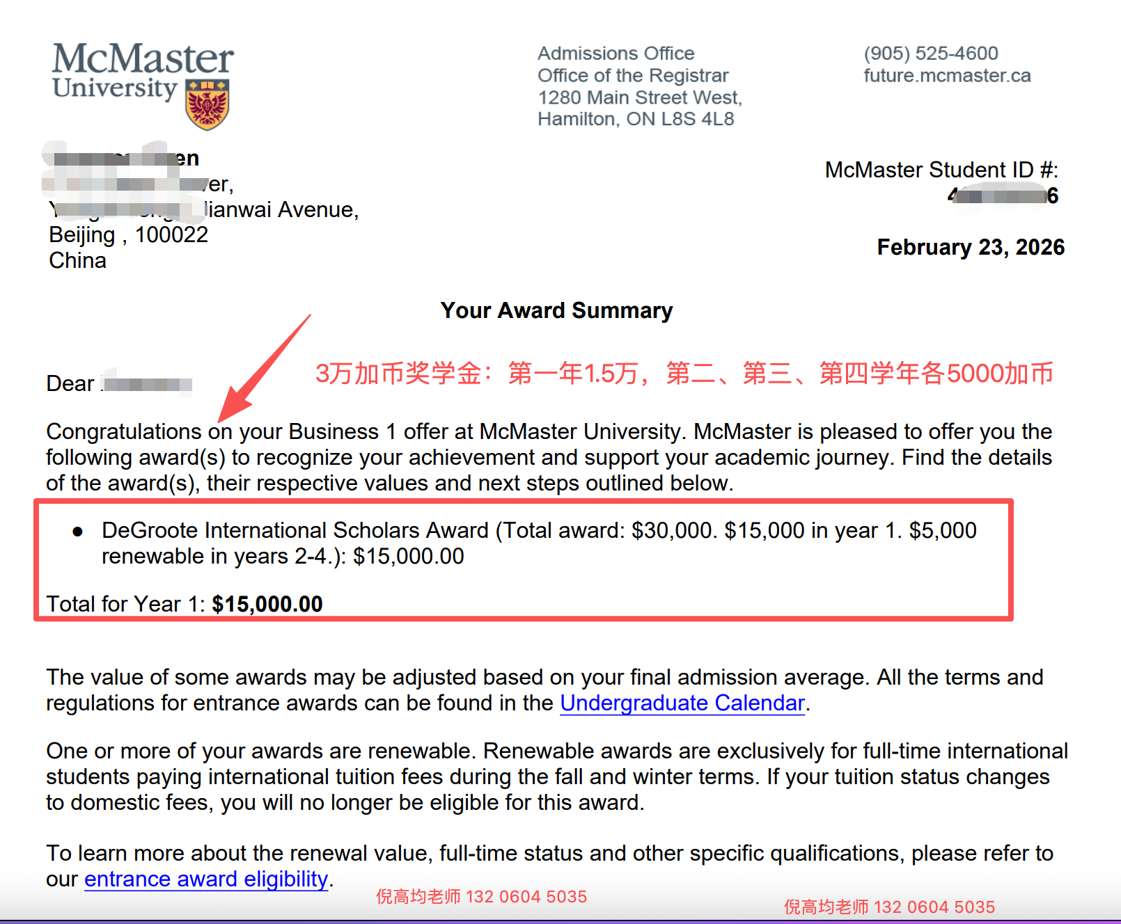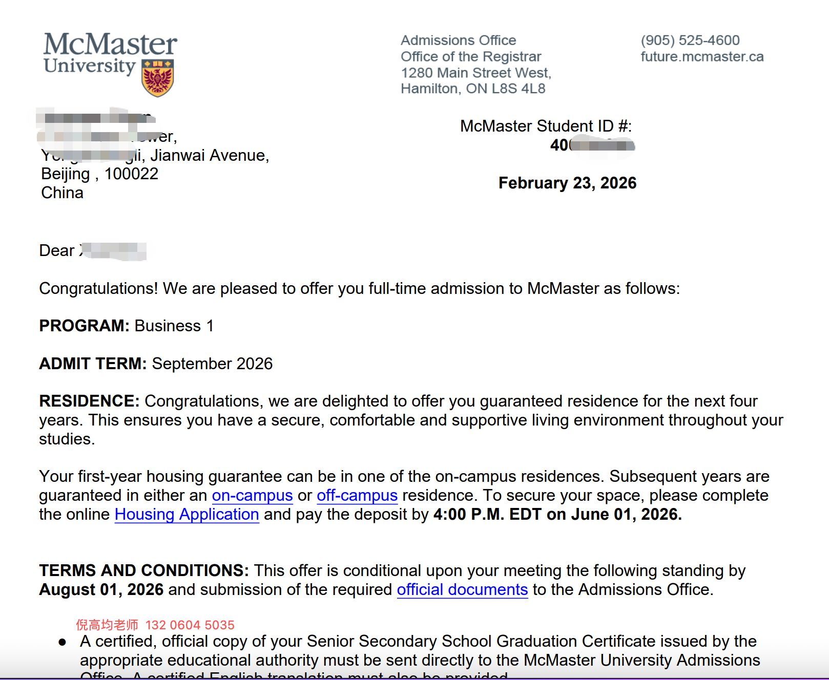 青春因规划而闪耀,奋斗因坚守而不凡。来自重庆某高中AP国际课程班的学子,在高一下便坚定了出国留学的初心,以远见卓识锚定方向,于高一下假期正式启动全方位留学规划,历经一年半的日夜深耕、多维打磨,不仅顺利斩获加拿大麦克马斯特大学2026年9月本科录取offer,更凭借优异的综合素养,荣获3万加币奖学金,用实力书写了重庆学子的海外逐梦篇章。