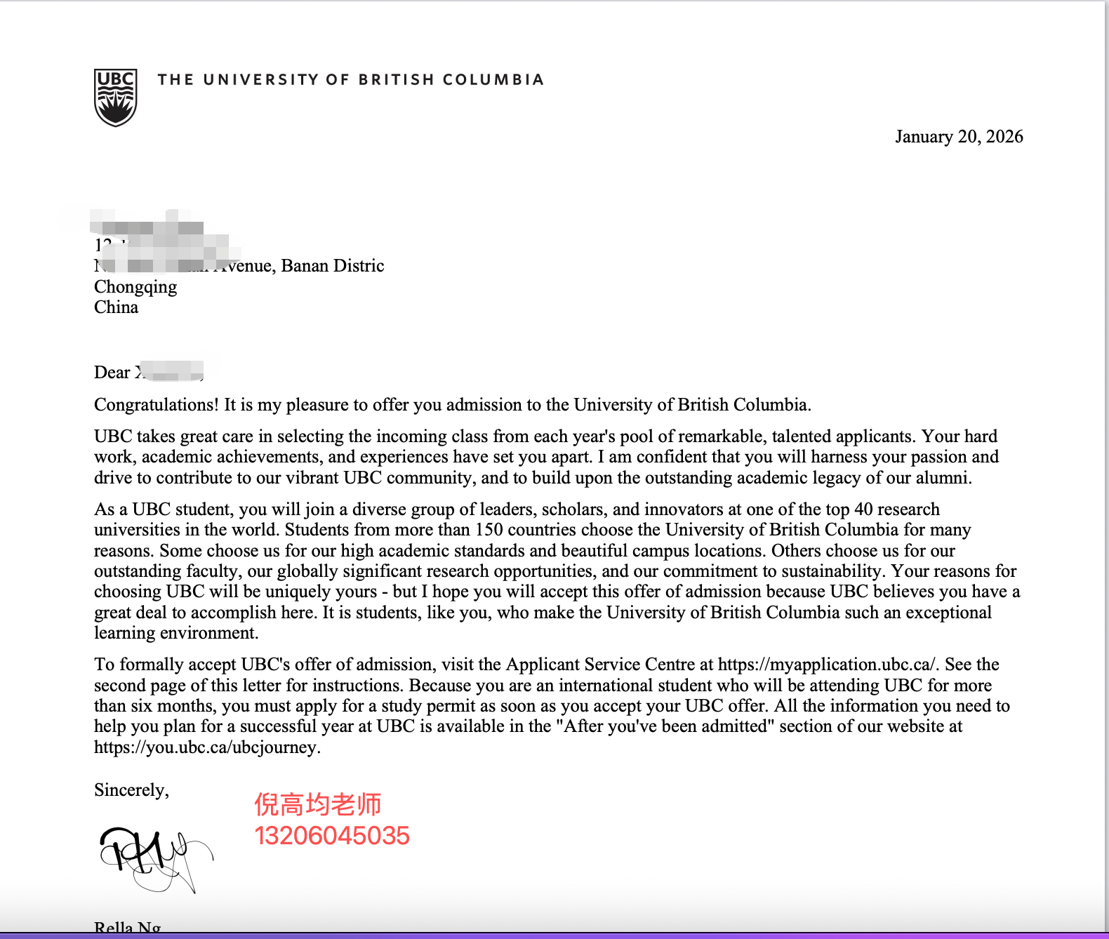 当青春遇见明确的方向,每一份努力都将绽放光芒。来自重庆某高中AP国际课程班的学子,用高一下的坚定抉择,高二起的全力以赴,历经一年半的沉淀与深耕,成功斩获加拿大英属哥伦比亚大学(UBC)2026年9月本科录取offer,用行动诠释了“规划先行,笃行致远”的成长真谛。