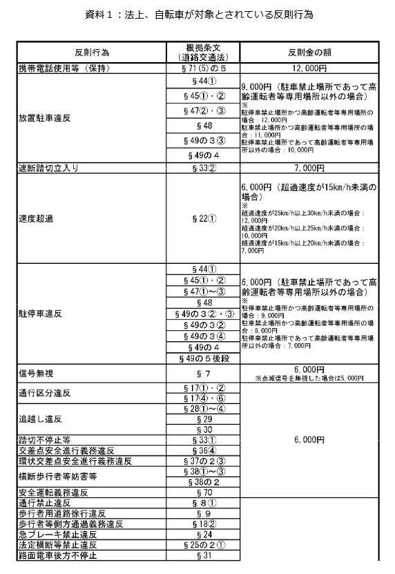 使用手机等(手持手机通话或注视屏幕):1万2千日元 ※ 此为自行车违章罚款中的高额