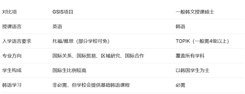 GSIS(Graduate School of International Studies)是韩国政府为培养国际化人才而设立的专业研究生院,课程以英语授课,聚焦国际关系、国际贸易、区域研究、发展合作等领域,适合未来希望从事外交、跨国企业、国际组织、学术研究等方向的学生。