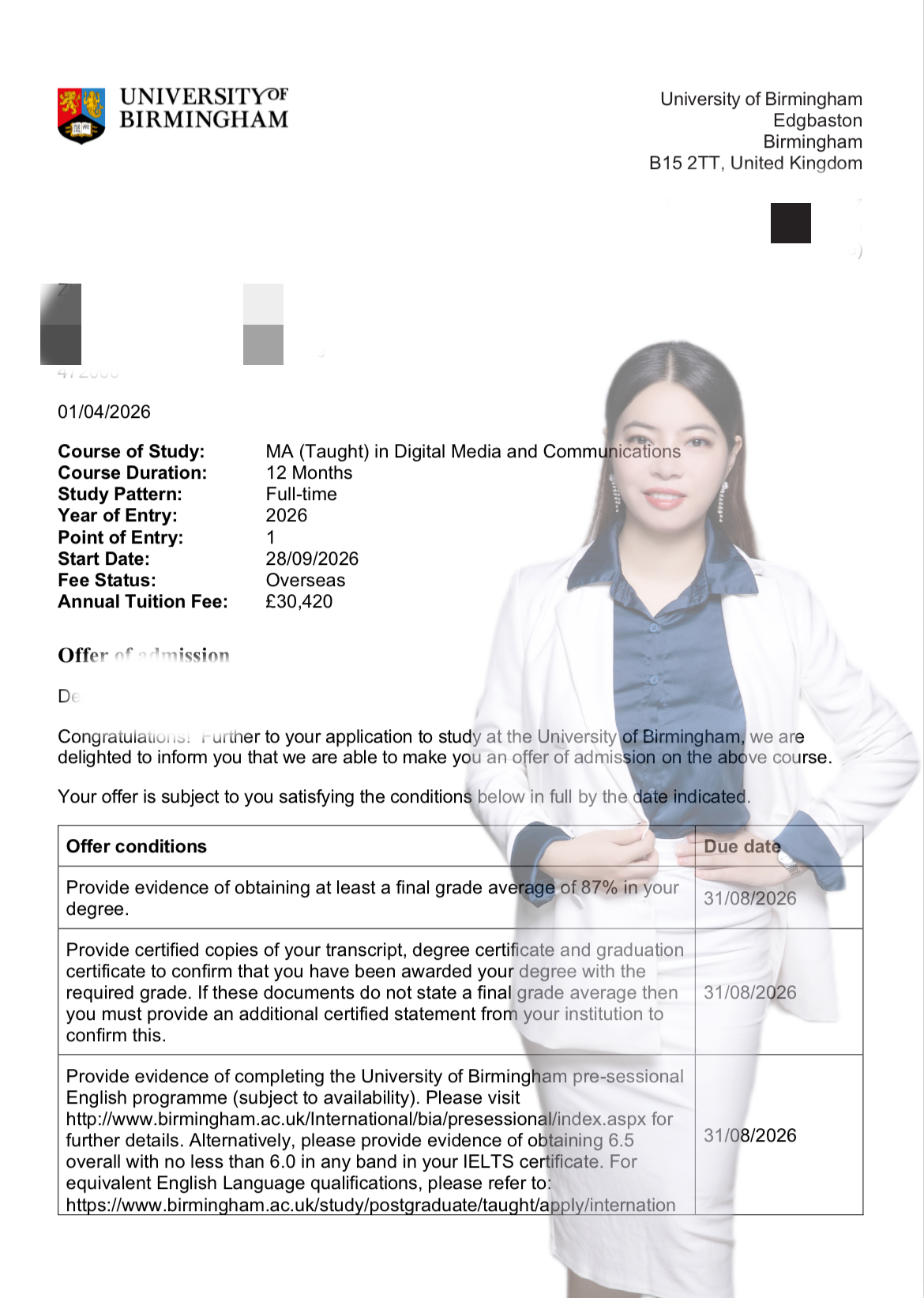 1. 专业适配:伯明翰的全球传播专业,侧重媒体传播、跨文化沟通,刚好和我本科网络与新媒体专业契合,我的论文研究、新媒体运营、公关实习经历,都能精准匹配专业需求;