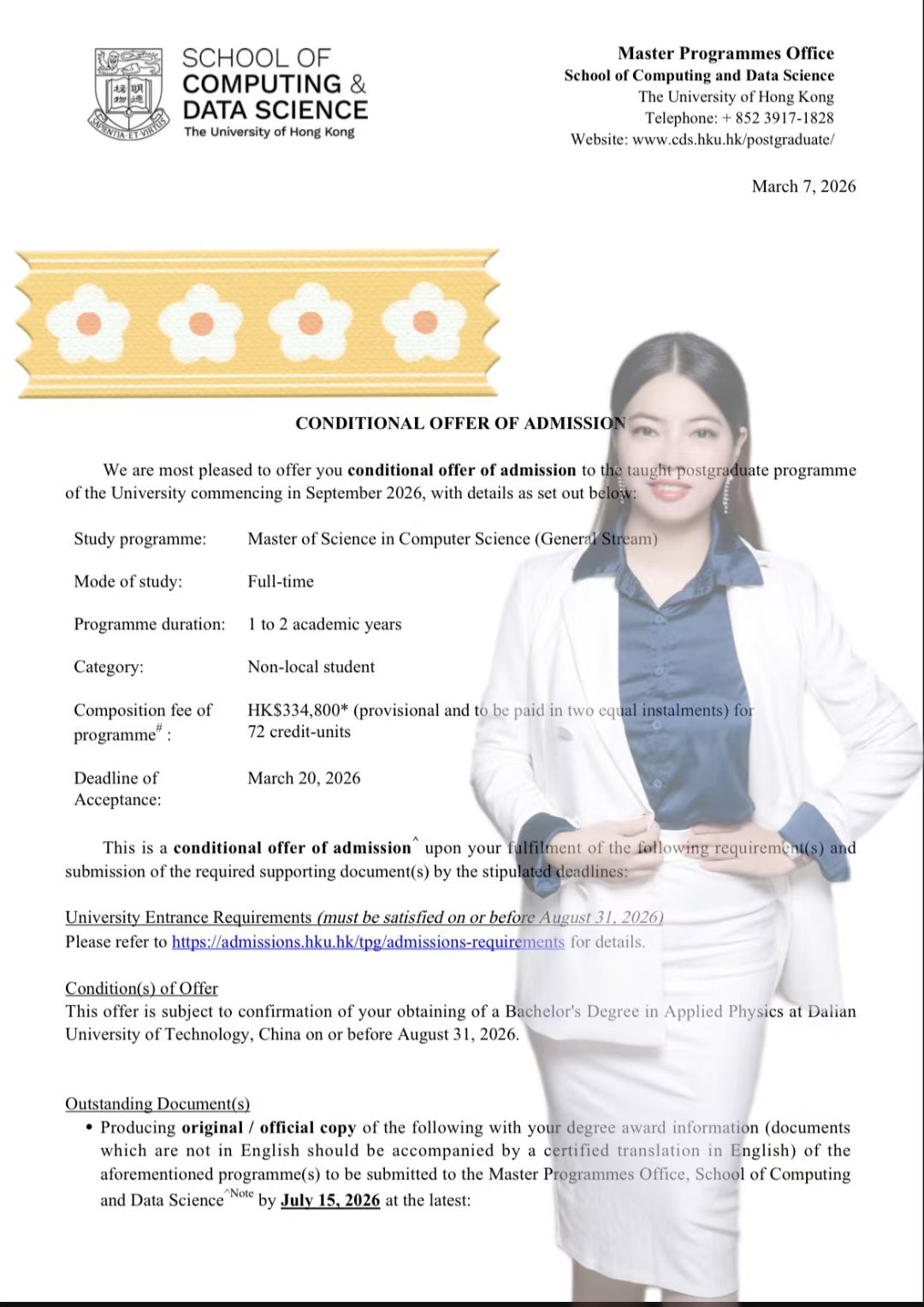于是果断调整职业规划,补充计算机名企实习,一步步把物理背景转化为优势,成功跨申香港大学计算机方向硕士