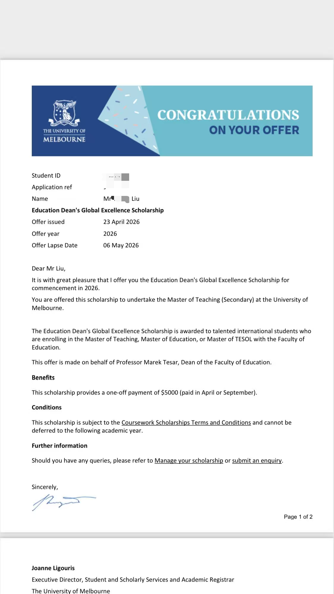 墨尔本大学教育学院院长全球卓越奖学金真的有吗?