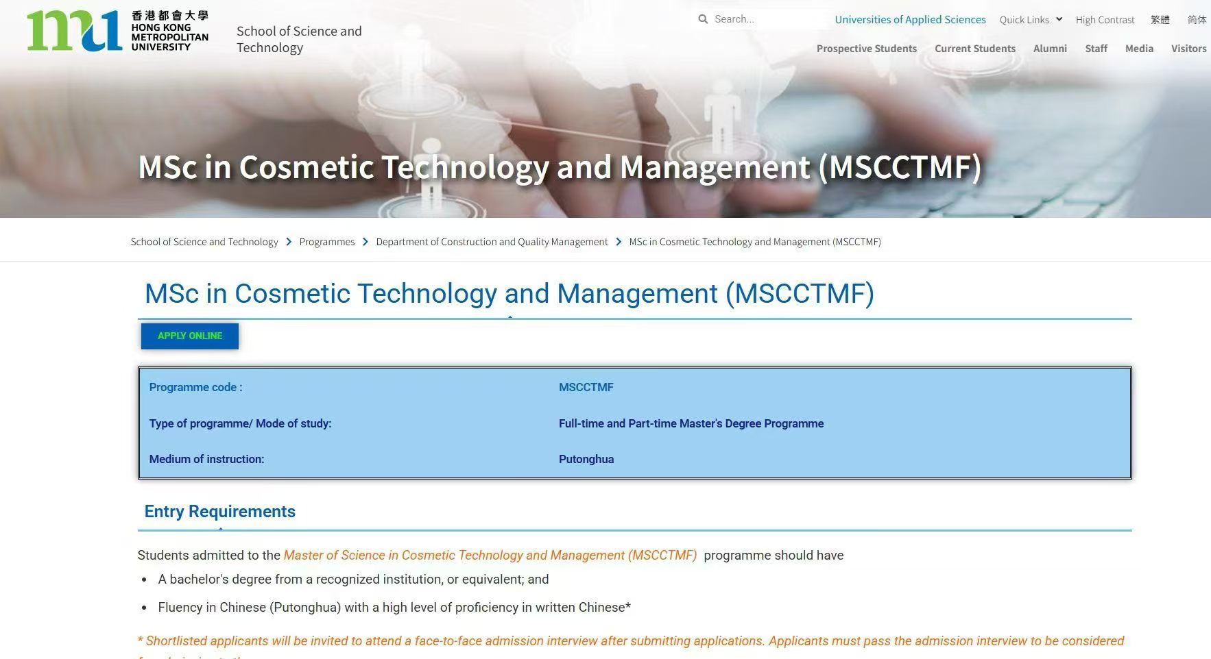 香港都会大学近期推出化妆品技术与管理理学硕士(MSc in Cosmetic Technology and Management,课程代码:MSCCTMF),面向内地及香港地区申请者开放,采用普通话授课,兼顾全日制与兼读制学习模式,为美妆及日化行业从业者提供系统的学历提升路径。
