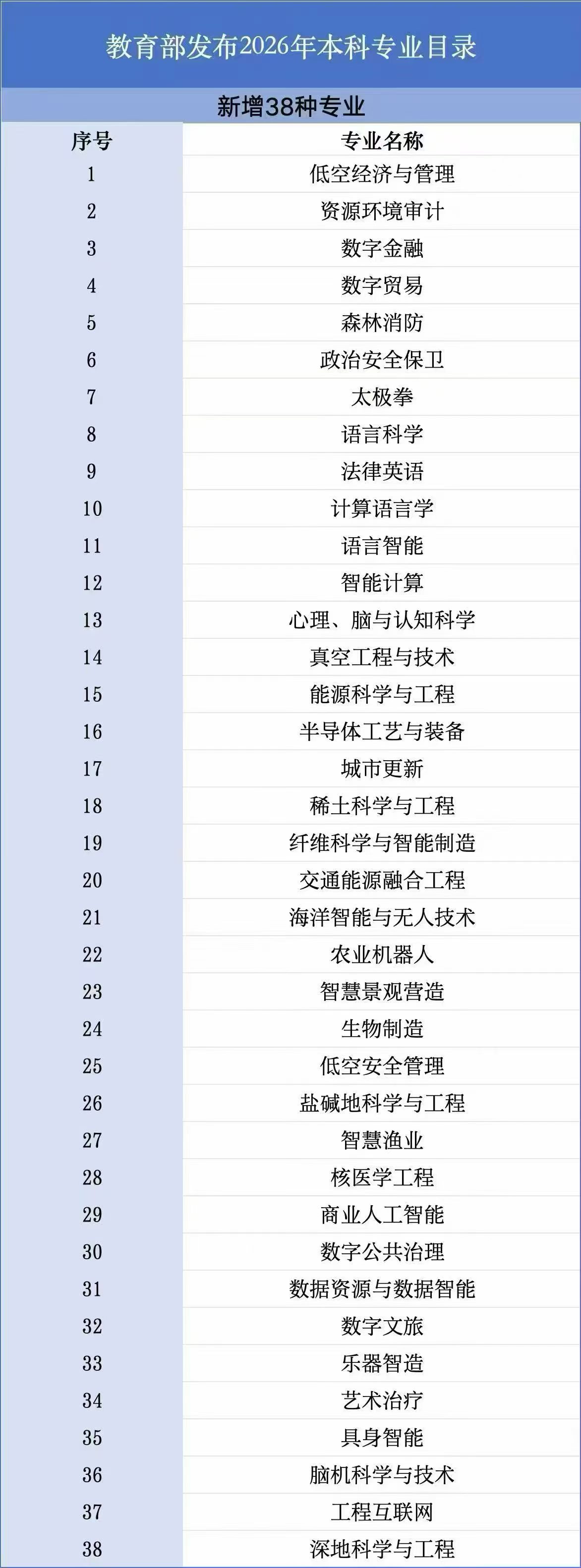 教育部今年持续推进专业设置调整优化工作,引导和支持高校积极增设服务国家战略和现代产业发展需求的新专业。精准对接国家战略需求,增设能源科学与工程、深地科学与工程等专业;服务传统产业优化升级,增设交通能源融合工程、农业机器人等专业;推动新兴产业和未来产业创新发展,增设生物制造、脑机科学与技术等专业;立足服务业扩能提质,增设数字文旅、商业人工智能等专业;聚焦打造智能经济新形态,增设数字贸易、数字金融等专业。同时,进一步完善战略急需专业超常设置机制,支持哈尔滨工业大学、北京航空航天大学等9所高校增设具身智能新专业,推动新一代人工智能与实体经济深度融合,赋能经济社会高质量发展。