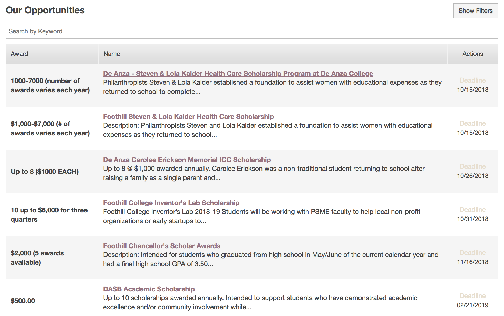 奖学金的网站是https://fha.acaemicworks.com/,在这里可以找到foothill-e anza大学提供的全部奖学金,点击你感兴趣的奖学金项目进入后会有更加详细的说明,比如最低GPA要求,基本情况要求。
