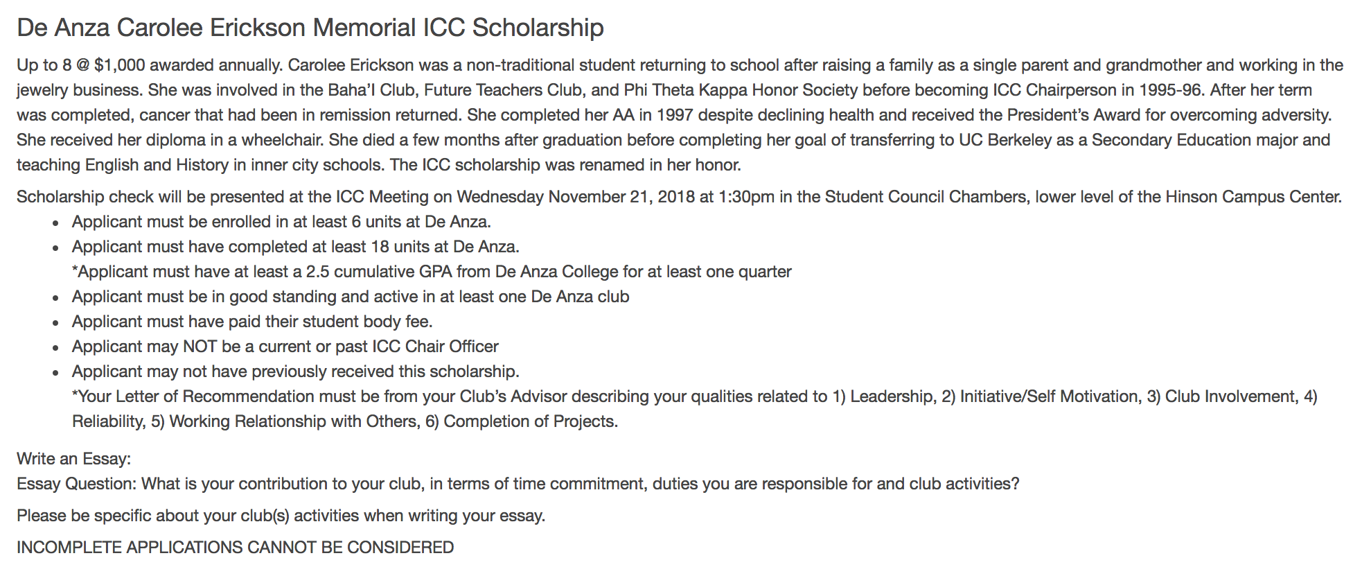 ** 在De Anza大学已修完18学分的课程(至少一个学期的GPA高于2.5) **