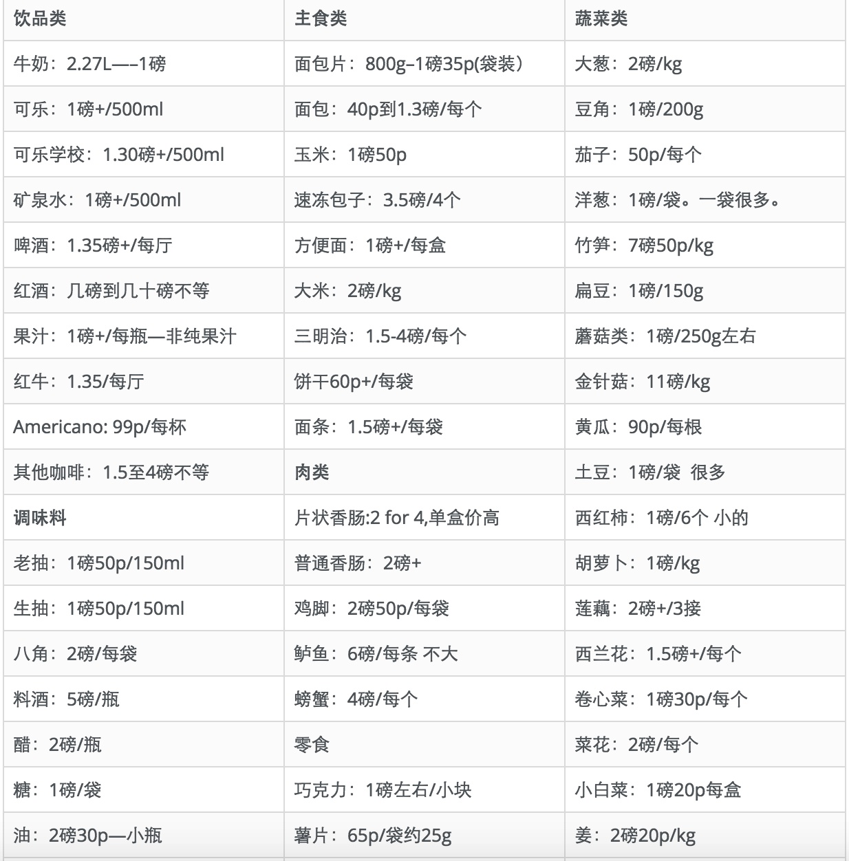 这里贴上曼彻斯特一些常见物品的价格,价格为常见普通超市或商店的价格: