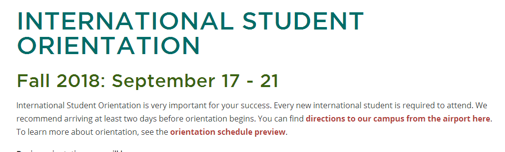 国际学生入读对你的成功很重要。每个新的国际学生都必须参加。我们建议至少在开学前两天到达。你可以从这里的机场找到我们校园的方向。要了解更多关于方向的信息,请参阅方向计划预览。