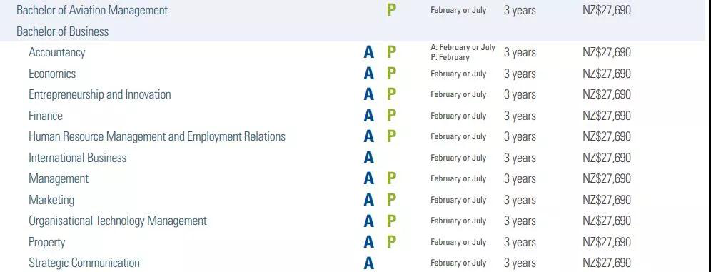 以下是一些常申商学院课程的基本信息,其中 A代表Aucklan校区、P代表Palmerston North校区、W代表Wellington校区,详细信息咨询 金吉列 留学 张娟老师。