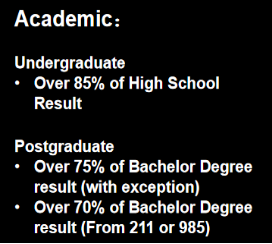 大学毕业 , 2.2以上学位(均分70%以上)。