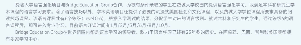 强化语言项目 位于杰佛逊大学校内,使用大学校内的设施与宿舍,通过英语培训、学术指导以及文化交流等特色项目帮助学生顺利完成大学本、硕专业学习与美国生活的过渡。