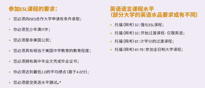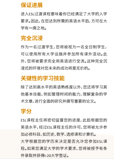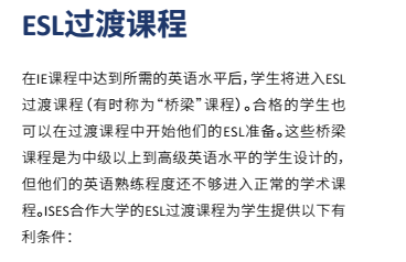 国际生以本科课程的有条件录取而开始他们的大学学习,就读英语作为第二语言( ESL )课程。通常,有两种类型的 ESL课程:强化英语课程(IE)以及ESL过渡课程。而 贝尼迪克坦学院提供 ESL过渡课程