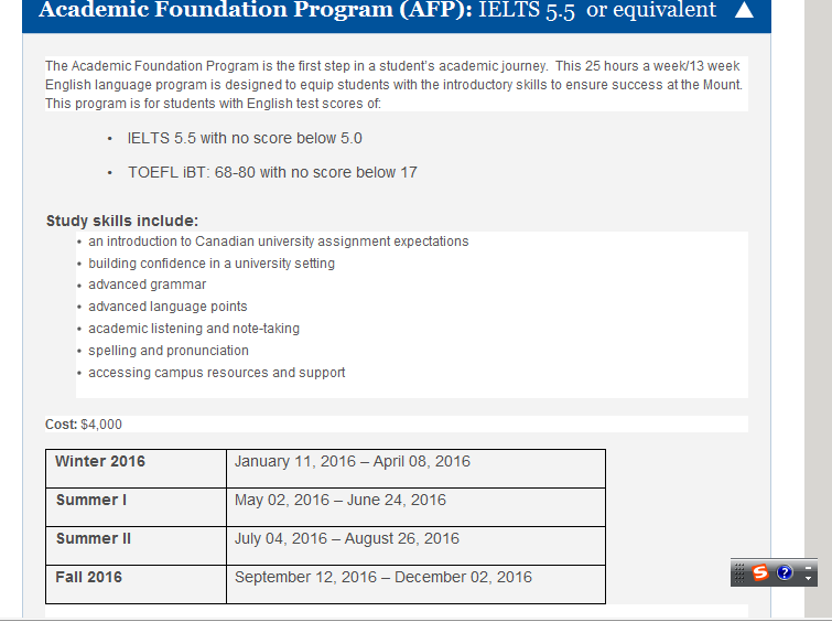 1. AFP 学术预科课程:要求雅思 5.5 单项不低于 5.0 ;共 13 周,每周 25 小时