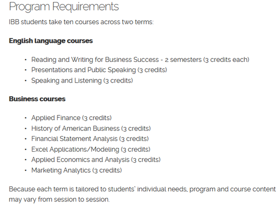 IBB 项目为期两学期,学生可以申请春季入学或秋季入学,连续上课两个学期。完成 IBB 项目的学习后,希望入读福特汉姆大学硕士项目并满足项目要求(如下文概述)的学生将可以进入福特汉姆大学加伯利商学院就读硕士项目,这些硕士项目录取须满足如下文所述的标准。