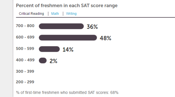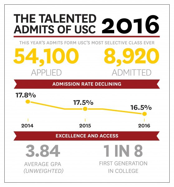 USC 2015录取人数8,920,申请人数54,100,录取率16.5%。录取学生GPA 4.0占比31,41%录取学生SAT/ACT成绩在所有参加考试学生中排名前1%。 录取学生SAT阅读单项600+占84%,我们同学考虑申请USC至少应该阅读单项在650+。68%录取的学生提交了SAT成绩。