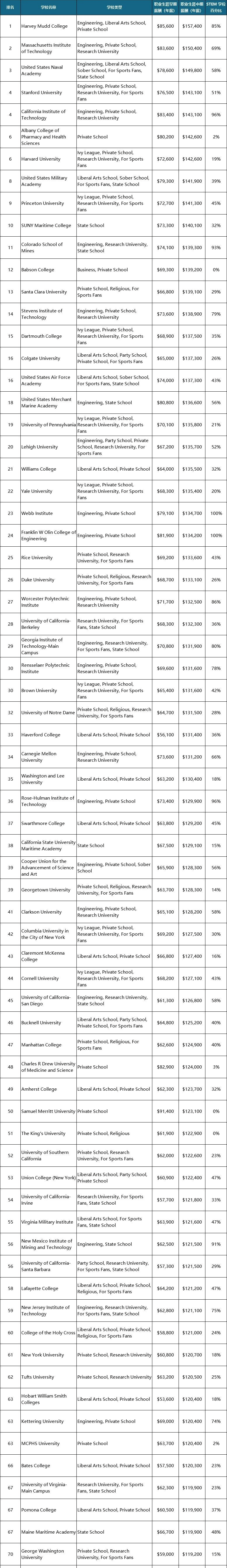 但这也并不代表文科类院校的没落! 华盛顿与李大学 ( Washington an Lee University)、 科尔盖特大学 (Colgate University)、 卡尔顿学院 (Carleton College)和 威廉姆斯学院 ( Williams college)等顶尖小型文理学院的工资都培养出了高收入的毕业生。