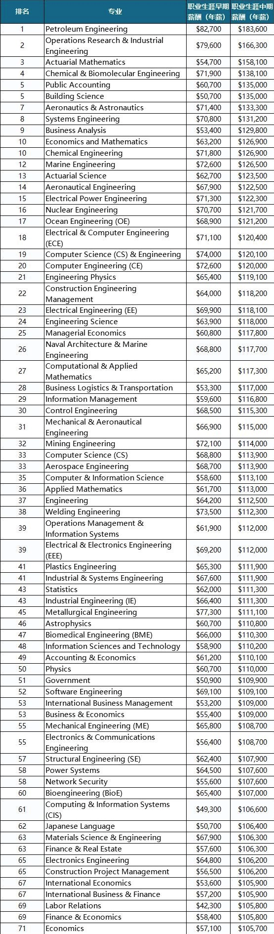 PayScale每年都会公布一份美国大学薪资水平报告,通过调查近三千所大学或学院毕业生薪资水平,直观地为大家选专业或择校提供一个重要参考。