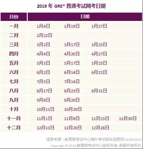 同时,NEEA还公布了2019年GRE考试日期,考位同样比较充足,计划报名的小伙伴可以开始报名啦!
