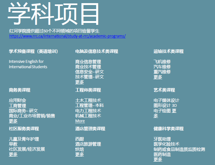 红河学院是加拿大曼尼托巴省最大的公立学校,是曼尼托巴省政府财政重点扶持的应用公立学院。红河学院也是中国教育部认可的加拿大公立学院之一。学院位于该省省会温尼伯,温尼伯有着优越的地理位置,被称作“加拿大的心脏”,是加拿大与美国的贸易枢纽。学院提供超过 200 个全日制专业课程和兼职课程,在校学生超过 3 万名。 94% 的毕业生在毕业后顺利找到工作, 92% 的学生对学院开设的课程非常满意。