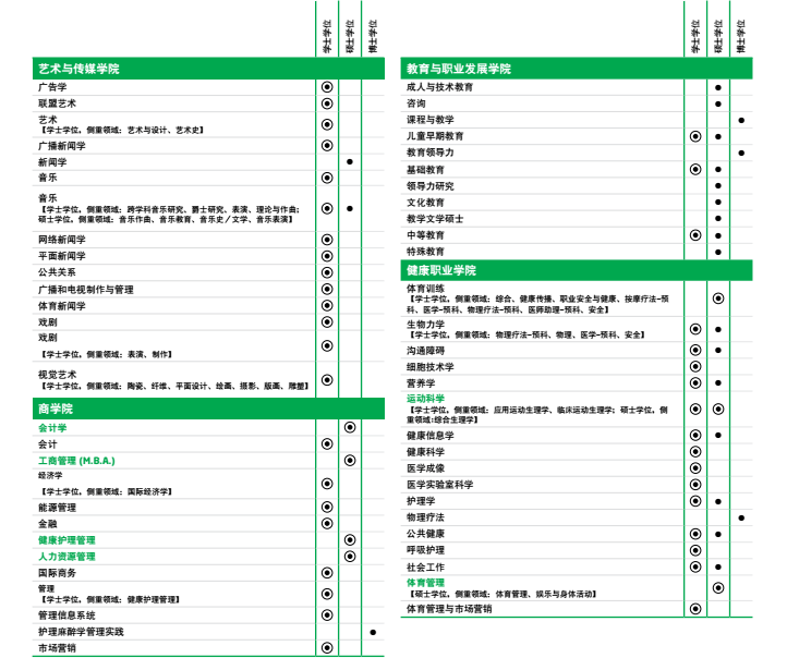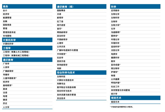 商务:会计学、工商管理、健康护理管理、人力资源管理。