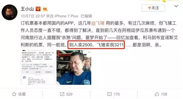 知名作家王小山就在微博爆料:自己在飞猪网买的机票,别人买花了2500,他花了3211。