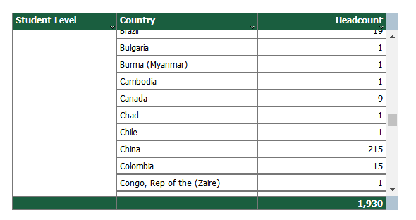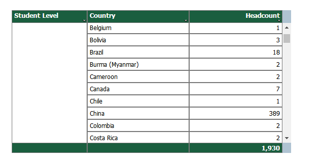 国际学生一共 1930 人 ,一年的本科新生 中国 389 人,本科二年级 215 人