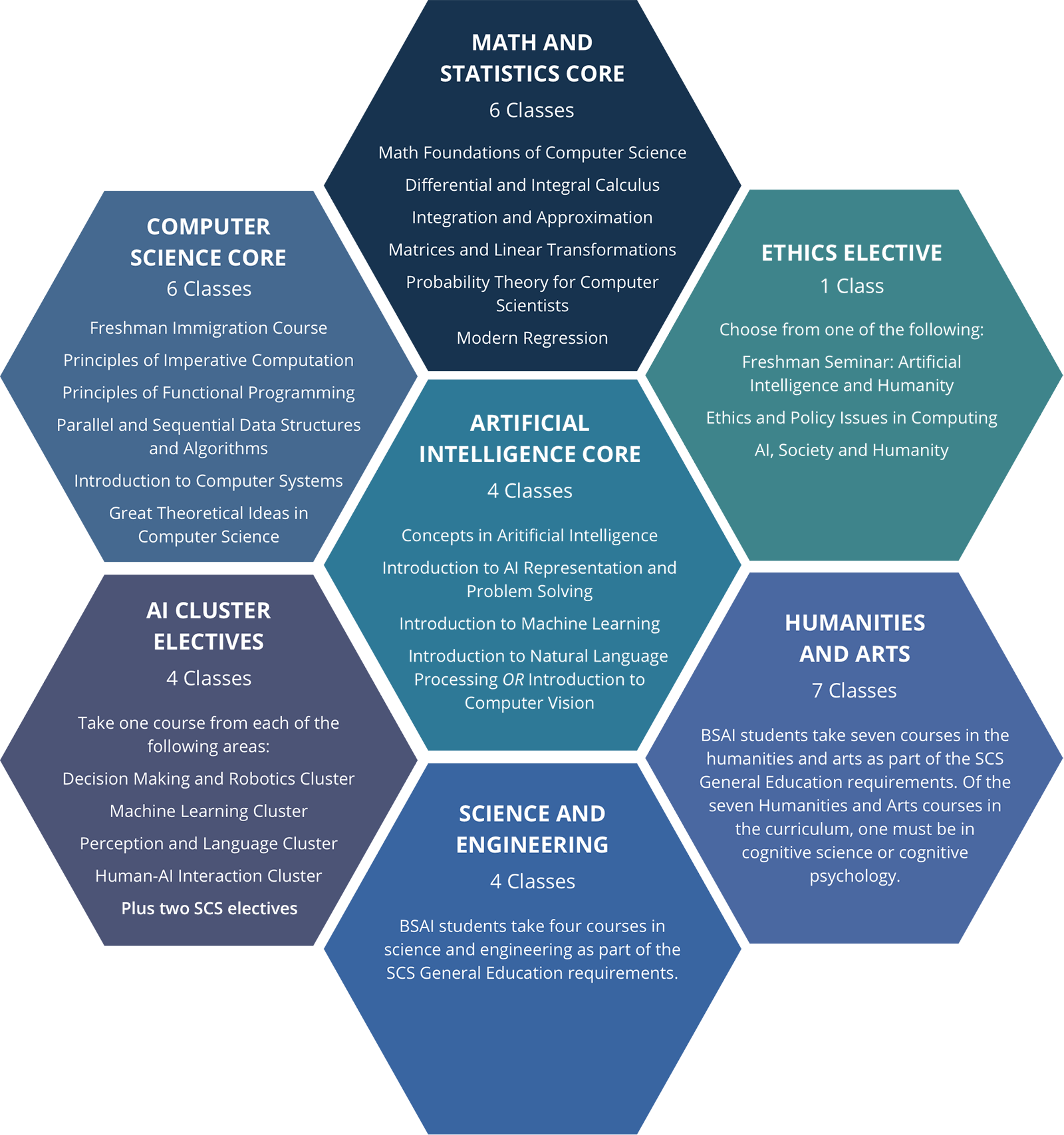 BSAI 学生参加 7 门人文和艺术课程,作为 SCS 通识教育要求的一部分。在课程中的 7 门人文和艺术课程中,必须有 认知科学 或 认知心理学 。例子包括:
