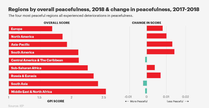 IEP发布的该项和平指数对各个国家和地区的犯罪率、冲突和军事化程度等进行了研究对比,主要衡量依据涉及三大领域二十余项指标,包括社会安全方面的谋杀率、监狱服刑人数、警察人数,军事方面的士兵人数、支出与经济实力的对比等。世界和平状况之所以更加恶化,IEP认为中东和北非地区的冲突是首要原因之一,叙利亚、阿富汗、南苏丹、伊拉克和索马里等的和平指数在全球排名垫底。从区域来看,欧洲是最风平浪静的地区,在和平指数排名前十位的国家中占据了6个席位,除了冰岛和奥地利,葡萄牙、丹麦、捷克、爱尔兰也跻身十强。虽然世界局势动荡,但新西兰在和平指数排行榜上的位置近年来稳如泰山。