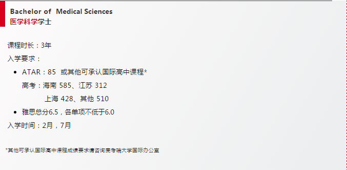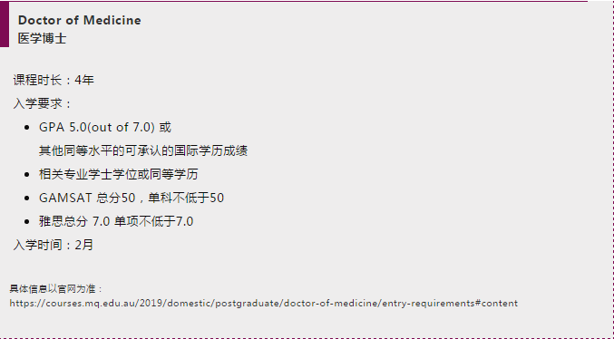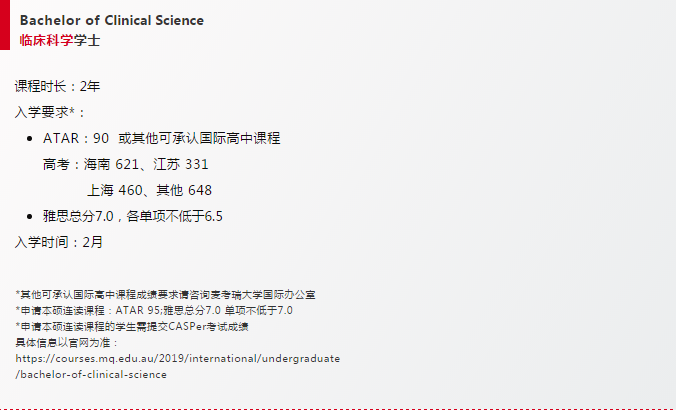 麦考瑞大学还为国际学生提供 Bachelor of Clinical Science + Doctor of Meicine (2+4年) 本硕连读课程。