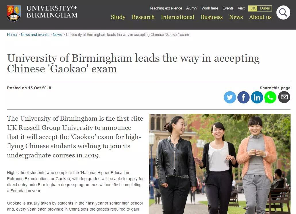 伯明翰大学发言人说,中国高考成绩已经被越来越多澳大利亚、美国、加拿大及欧洲大陆国家的高等院校认可,伯明翰大学只考虑高考成绩 80%以上、并满足其他学术和英语语言要求的高素质学生。