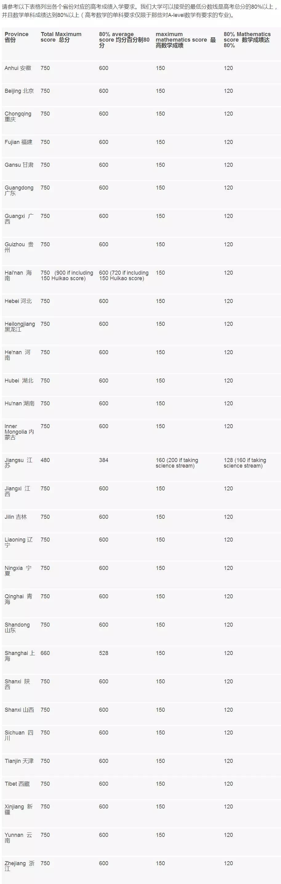 所以,伯明翰大学也给出了各个省份对应的 2018高考成绩入学要求。
