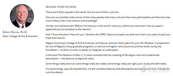 上面是艺术与科学学院院长 Robert Herron 博士的一些寄语,全世界 80 亿人口,你是其中也是唯一的一个你, regent university 艺术与科学学院将帮助您发现上帝对您生活的计划。无论是为 regent university 的研究生课程做准备,还是为世界各地的国家和文化服务,我们都有非常扎实的基础和思考,写作,语言,融合以及自己的理解。