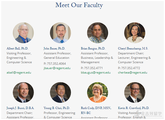 萨尔瑞金那大学的师资力量也是非常的雄厚,上面是几位学院的优秀教师,仅仅也只是上百位优秀教师中的一角。萨尔瑞金那大学在高学术标准和严格课程的氛围中,致力于提供创新的学习环境,为了学生们独特的要求。学校的研究生和本科课程提供在社会里成长的必须课程。专业都提供在线学位,并且可管理的为期八周的课程,为学生提供灵活的课程安排,使他们的课程安排与他们的生活安排得当。 Regent University 致力于培养有能力的学生,使他们在思想和精神上都表现出色。让学生能在社区,国家,甚至于世界上都能发挥自己的长处。