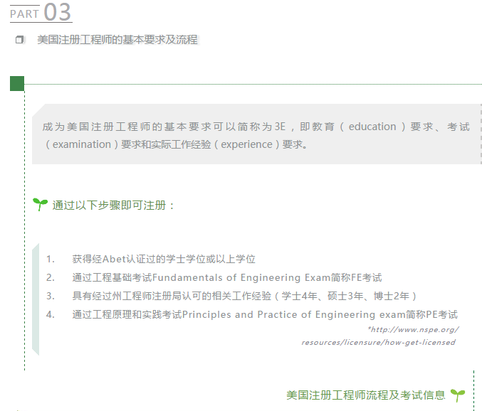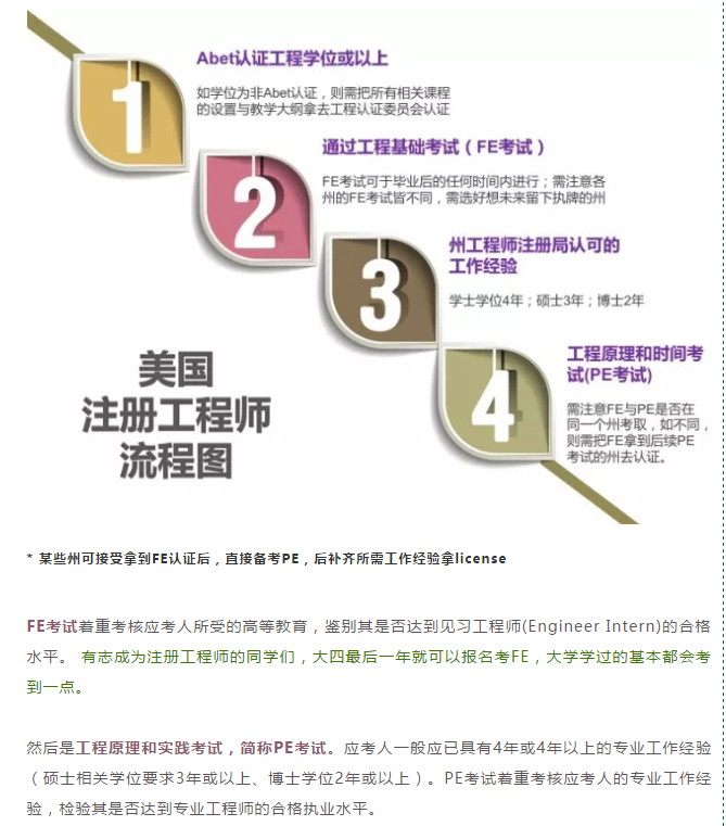 某种程度上说,毕业后通过工程基础考试FE,再累积到一定的工作经验并通过专业PE考试后,则可称为注册工程师,就是我们所谓的执牌人士。