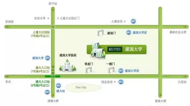 建国大学地理位置优越,位于首尔市内二号线上建大入口站